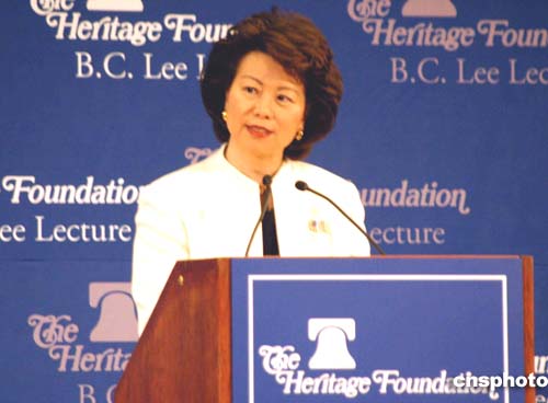 今年五十一歲的趙小蘭是美國第二十四任勞工部長,她是二00一年一月二十九日由美國參議院批準(zhǔn)就任的,從而成為美國歷史上第一位躋身內(nèi)閣的亞裔女部長。擔(dān)任勞工部長之前,趙小蘭曾擔(dān)任過美國交通部副部長和美國交通部航運(yùn)署副署長等公職。