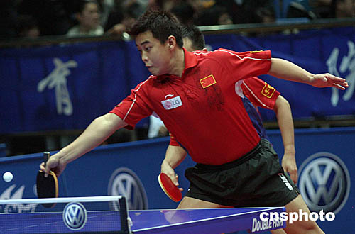 | 十二月十一日,在北京舉行的二零零四年國(guó)際乒聯(lián)巡回賽總決賽結(jié)束了男雙半決賽的比賽,中國(guó)選手孔令輝和王皓繼隊(duì)友馬琳和陳杞之后,以四比一輕松擊敗奧運(yùn)亞軍、中國(guó)香港組合李靜和高禮澤,與隊(duì)友馬琳和陳杞會(huì)師決賽。圖為王皓、孔令輝在比賽中。中新社記者:盛佳鵬