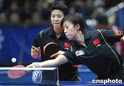 十二月十二日晚,王楠/張怡寧在北京舉行的大眾汽車(chē)2004年國(guó)際乒聯(lián)職業(yè)巡回賽總決賽女雙決賽中戰(zhàn)勝郭躍/牛劍鋒,奪得女雙冠軍。作者:武仲林