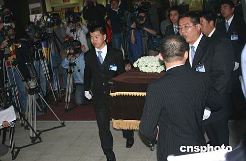 蔣經國遺孀蔣方良女士因肺癌末期導致心肺衰,于十五日十二時四十分病勢臺北“榮民總醫(yī)院”,享年八十八歲。圖為葬儀人員正對靈柩送往暫厝地進行最后預演。中新社記者:黃少華