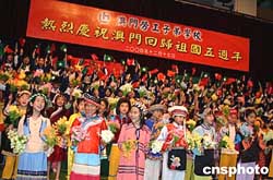 五年后的今天,又一群澳門學(xué)生穿上了這五十六套服裝,一則慶祝澳門回歸祖國五周年,另外也為了歡迎三位平凡又可敬的浙江老人。