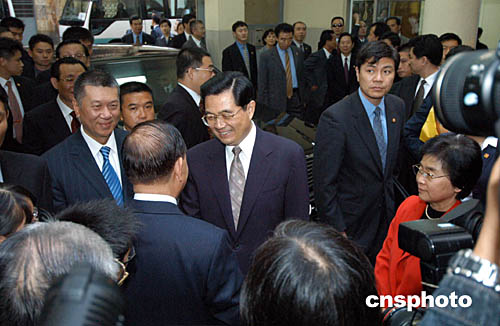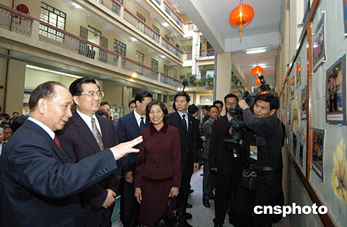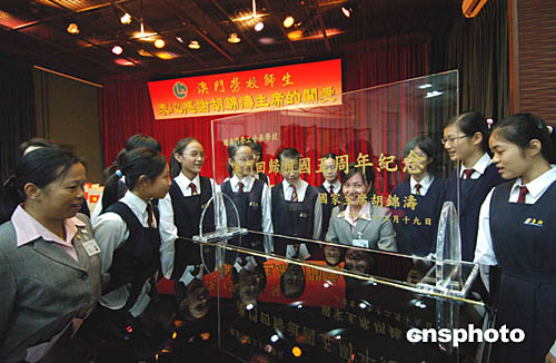 胡錦濤與夫人劉永清在澳門特首何厚鏵的陪同下參觀澳門勞工子弟學(xué)校,受到學(xué)校師生的熱烈歡迎。作者:梁永強