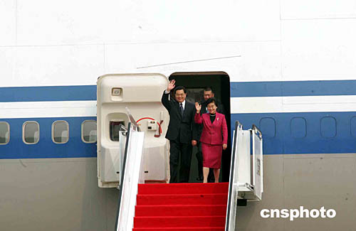 國家主席胡錦濤乘專機抵達澳門國際機場。圖為他向前往采訪的記者揮手致意。作者:董會峰
