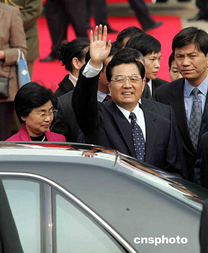 胡錦濤在何厚鏵的陪同下,向歡迎的當?shù)孛癖姄]手致意。