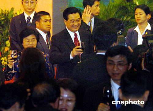晚七時(shí),在澳門警察局銀樂(lè)隊(duì)奏響的迎賓曲和二百多名各界嘉賓的熱烈掌聲中,胡錦濤主席和夫人劉永清在澳門特區(qū)行政長(zhǎng)官何厚鏵及夫人劉渭楨的陪同下步入宴會(huì)廳。