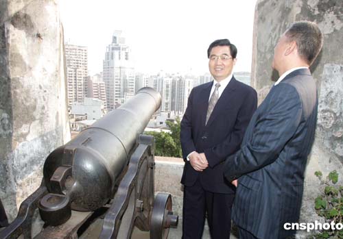 12月19日下午,首次到達(dá)澳門的胡錦濤主席饒有興趣地參觀了當(dāng)?shù)刂包c(diǎn)大炮臺。作者:宗金柱