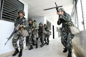整個(gè)演習(xí)分為兩個(gè)階段進(jìn)行。第一個(gè)階段是中級和高級軍官在指揮所里用電腦進(jìn)行戰(zhàn)爭模擬,完全是虛擬世界的真實(shí)戰(zhàn)爭;第二個(gè)階段則是實(shí)兵演習(xí),主要是演練特種部隊(duì)如何應(yīng)對滲入后方的敵人。