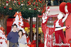 臨近圣誕節(jié),香港商場圣誕布置繽紛,又別出心裁。圖為情侶在又一城商場留影。作者:譚達明