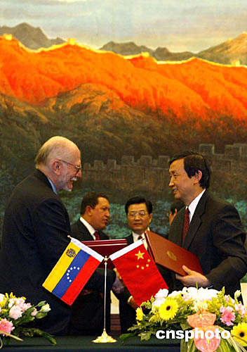 中國(guó)國(guó)家主席胡錦濤十二月二十三日在北京人民大會(huì)堂會(huì)見(jiàn)了委內(nèi)瑞拉玻利瓦爾共和國(guó)總統(tǒng)烏戈·拉斐爾·查韋斯·弗里亞斯。雙方政府就經(jīng)濟(jì)技術(shù)合作問(wèn)題簽署了八項(xiàng)協(xié)議。中新社記者:廖文靜