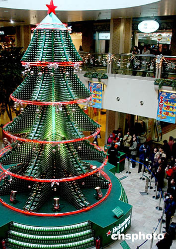 十二月二十四日,一座用啤酒瓶搭建的巨型“圣誕樹”亮相北京東方廣場,吸引過往行人駐足觀看。作者:韓藝冰