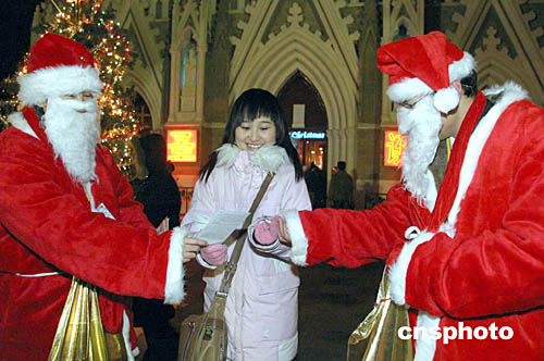 十二月二十四日晚,在北京西什庫教堂門前,“圣誕老人”正在給行人派發(fā)圣誕禮物,共度圣誕平安夜。作者:張勤