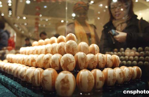 | 十二月二十六日,中外游人正在觀看用雞蛋殼雕刻出的《水滸》人物“一百單八將”。二十四日,北京民間藝術(shù)展開(kāi)始在中華世紀(jì)壇舉行,同時(shí)展出的還有風(fēng)箏、泥塑、面塑、毛猴、剪紙、蛋雕、京劇臉譜等二十多個(gè)藝術(shù)門(mén)類的二百八十件民間工藝品。作者:韓藝冰