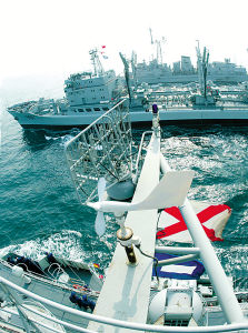 此次演練中,補給演練尤其引人注目。當(dāng)中方指揮員張盤洪少將下達補給命令后,“哈爾濱”號、“拉圖什特威爾”號和“比羅司令”號3條戰(zhàn)艦呈倒品字形圍繞“洪澤湖”號航行,先后進行了3艦同時補給和單艦補給模擬演練。據(jù)了解,補給演練內(nèi)容是延長戰(zhàn)斗力的訓(xùn)練課目,是檢驗海軍遠海聯(lián)合作戰(zhàn)能力的訓(xùn)練。
