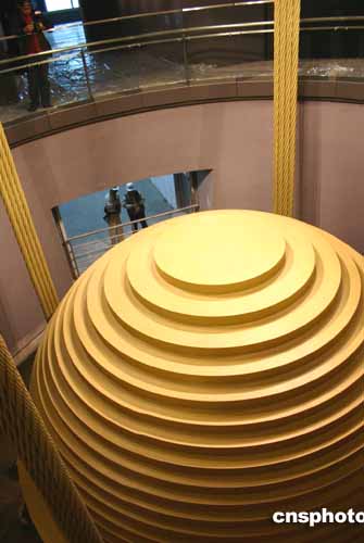 | 臺(tái)北101大樓八十九層觀景臺(tái)12月28日下午向媒體開放,樓內(nèi)安裝的世界最大風(fēng)阻尼器引人注目。該風(fēng)阻尼器球體直徑五點(diǎn)五米,重達(dá)六百六十公噸,從大樓九十二層懸掛到八十八層,對因地震、強(qiáng)風(fēng)造成的水平偏移能產(chǎn)生百分之四十以上的反作用,是世界最大也是唯一外露的風(fēng)阻尼器。作者:黃少華