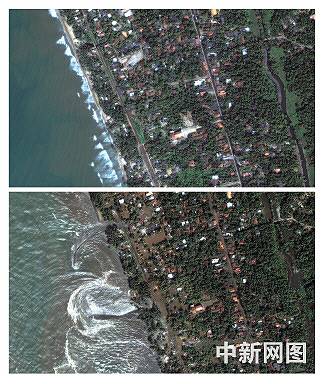 這張合成圖片來(lái)自2004年12月29日“電子全球”接收到的衛(wèi)星圖片。上方圖片攝于2004年1月1月,下方圖片則攝于當(dāng)?shù)貢r(shí)間2004年12月26日上午10點(diǎn)20分。當(dāng)時(shí)一場(chǎng)海嘯剛剛席卷了斯里蘭卡西南部卡魯塔拉市,翻卷的海水正在涌出海岸線外。