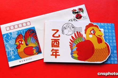 北京市郵票公司為配合國家郵政局于2005年1月5日發(fā)行《乙酉年》特種郵票(1套1枚),特設計印制了該郵票的首日封(左)、郵折(右)郵冊卡書等郵品,并將與郵票同日發(fā)行!兑矣夏辍诽胤N郵票面值人民幣80分,是中國發(fā)行的第三輪生肖郵票的第二套。在十二生肖排序中,雞象征著振奮和吉祥,故民俗中有“金雞報曉”和“金雞起舞”等說法。作者:鄒憲