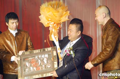 十二月三十日,中國知名家具企業(yè)——曲美家具公司在北京順義的“曲美工業(yè)園”舉行曲美二零零五經(jīng)銷商年會(huì)暨新產(chǎn)品發(fā)布會(huì),歷屆金雞、百花獎(jiǎng)最佳男演員得主、北京曲美家具形象代言人葛優(yōu)(右),與中國著名導(dǎo)演馮小剛(左)親臨現(xiàn)場,向北京曲美家具公司總裁趙瑞海先生(中)贈(zèng)送《天下無賊》經(jīng)典劇照以表示祝賀。作者:盛佳鵬