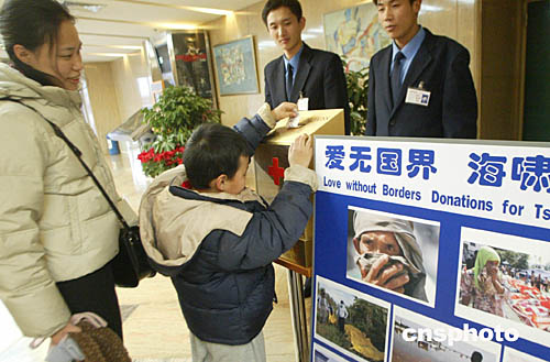 元旦假日期間,北京市民在各區(qū)縣設立募捐站,為遭受印度洋海嘯受災的國家捐款。中新社記者:錢興強
