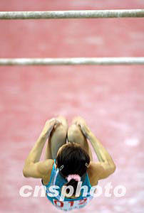 2004年5月15日,2004全國(guó)體操錦標(biāo)賽暨奧運(yùn)會(huì)預(yù)選賽的女子資格賽在江蘇省蘇州市體育中心體育館舉行,來(lái)自全國(guó)19個(gè)省市的代表隊(duì)參加了此次比賽。圖為女子高低杠比賽。中新社記者:盛佳鵬