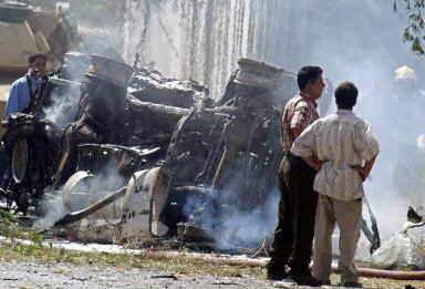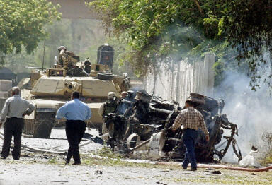 自從美軍進(jìn)駐巴格達(dá)后,汽車爆炸似乎成了家常便飯,救援工作也因此變得駕輕就熟。薩利姆的汽車被炸后不久,數(shù)輛救護(hù)車便趕到了現(xiàn)場(chǎng),戴著面具和橡膠手套的救援人員迅速行動(dòng)起來,從被汽車殘?bào)w里往外拖那些已經(jīng)被燒得血肉模糊的尸體。聞?dòng)嵍鴣淼挠浾邆兛吹,現(xiàn)場(chǎng)現(xiàn)場(chǎng)散落著鞋子和碎尸,一只被炸斷的腳恐怖地掛在30米以外的錢絲網(wǎng)上。