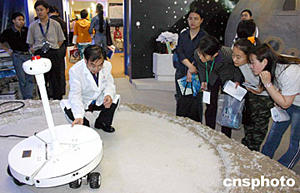 五月中旬,正在北京舉行的“二零零四全國(guó)科技活動(dòng)周暨北京科技周”上一款月球機(jī)器人首次亮相。這款機(jī)器人名叫“喀嗎哆”,能跨越障礙并進(jìn)行三百六十度觀察和攝像記錄。作者:徐曦弋