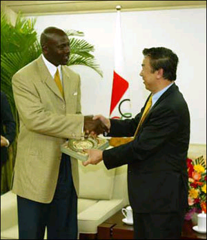 喬丹首先對(duì)中國奧委會(huì)和袁偉民主席的接見表示感謝,他說:“這是我第一次來中國,我期待著見到更多的球迷。我在NBA打球時(shí),曾經(jīng)與中國球星姚明等同場(chǎng)競(jìng)技,感覺非常愉快。本次中國之行的主要目的就是與中國青年接觸,通過籃球教育青年,推廣籃球!