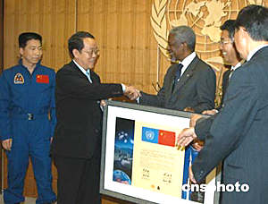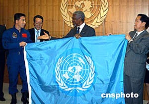中國首飛航天員楊利偉(左)代表中國,向聯(lián)合國秘書長安南(右)移交了“神舟”五號飛船所攜載的聯(lián)合國旗。作者:陳建