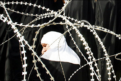 一名伊拉克婦女站在阿布格萊布監(jiān)獄外的帶刺鐵絲網(wǎng)旁,希望獲得親人的消息。