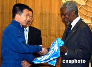 據(jù)報道,“神舟”五號飛船同時還搭載了一面未經(jīng)展示的大尺寸聯(lián)合國旗,這面旗長180厘米,寬120厘米,重約330克,這面旗幟此次也由楊利偉一并移交聯(lián)合國。
