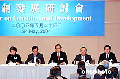 香港政制發(fā)展專責(zé)小組委托中央政組,于5月24日在會展中心舉辦首場政制發(fā)展研討會,主題為專責(zé)小組發(fā)表的第三號報(bào)告書中,有關(guān)2007年行政長官及2008年立法會產(chǎn)生辦法可考慮修改地方。 地方。作者:洪少葵