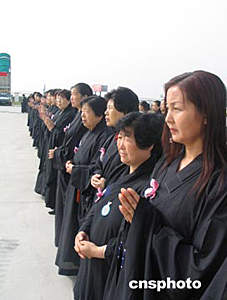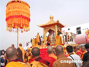 在儀式上,一誠法師、覺光法師、學(xué)誠法師分別拈香,誦經(jīng)、跪拜。來自西安大慈恩寺六十多名僧侶儀仗隊(duì)高奏佛樂,數(shù)百名佛家居士齊聲念佛。