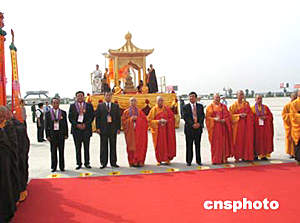 此前,從早晨九時(shí)半時(shí)開始,在機(jī)場停機(jī)坪舉行了一個(gè)約三十分鐘的恭送儀式。參加的人士有中國佛教協(xié)會(huì)會(huì)長、內(nèi)地恭送團(tuán)團(tuán)長一誠法師;中國佛教協(xié)會(huì)副會(huì)長圣輝法師;香港佛教聯(lián)合會(huì)會(huì)長、香港迎請團(tuán)團(tuán)長覺光法師;中國國家宗教事務(wù)局副局長楊同祥、陜西省副省長張偉等,總?cè)藬?shù)為八百多人。