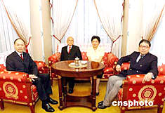 全國(guó)政協(xié)副主席、中共中央統(tǒng)戰(zhàn)部部長(zhǎng)劉延?xùn)|25日抵達(dá)香港,并看望全國(guó)政協(xié)副主席霍英東。圖為霍英東與兒子霍震霆(右)及霍震寰(左)與劉延?xùn)|合照。作者:洪少葵