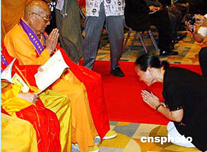 中新社香港五月二十六日電(記者邢健)“香港佛教暨各界迎請(qǐng)佛指舍利瞻禮祈福大會(huì)”開幕典禮今天(佛誕日)在香港會(huì)展中心隆重舉行。專程前來的全國(guó)政協(xié)副主席、中共中央統(tǒng)戰(zhàn)部部長(zhǎng)劉延?xùn)|和香港行政長(zhǎng)官董建華等在開幕式共同啟動(dòng)亮燈按鈕,安放佛指舍利的禮臺(tái)頓時(shí)大放光明,佛指舍利清晰地呈現(xiàn)在信眾面前。