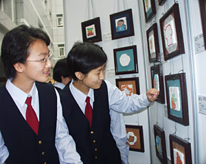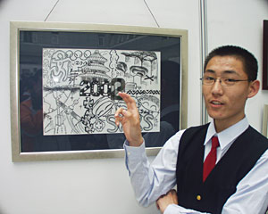記者在展覽上看到,在寬敞的大廳內(nèi),擺滿了學(xué)生創(chuàng)作的作品,包括版畫、民間剪紙、刮畫、紙雕、面具、漫畫、海報(bào)、中國(guó)結(jié)等十多種,內(nèi)容涉及更廣,如環(huán)保、奧運(yùn)會(huì)、行為規(guī)范、國(guó)慶等。十四歲的葛雅靜,看上去十分靦腆。這次展覽她如魚(yú)得水,有五幅作品入選,是所有參展學(xué)生最多的。她的刮畫極富想象力豐富,吸引觀者駐足。據(jù)她說(shuō),父母都不是從事藝術(shù)工作的,她是上藝術(shù)課上后,逐漸發(fā)現(xiàn)自己愛(ài)上畫畫了。