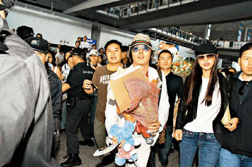 張赫戴上帽,身穿白衫白褲;全智賢則穿黑褸和牛仔褲,在昨午1時(shí)30分抵港,電影公司聘請(qǐng)了廿多位保安在機(jī)場(chǎng)護(hù)送兩人,但當(dāng)他們出閘時(shí),熱情Fans一擁而上,更突破了防線,令場(chǎng)面變得混亂;靵y中,張赫的Fans欲送鮮花給偶像,但卻錯(cuò)手擊中全智賢的頭部,“中頭獎(jiǎng)”的全智賢用手摸頭頂呼痛,之后一度黑口黑臉。