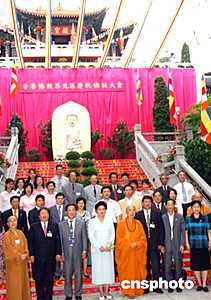 全國政協(xié)副主席、中共中央統(tǒng)戰(zhàn)部部長劉延?xùn)|,五月二十七日來到香港觀宗寺參觀,圖為劉延?xùn)|、國家宗教局局長葉小文、覺光法師、香港特區(qū)民政事務(wù)局局長何志平等一起在大雄寶殿前合影留念。作者:錢興強