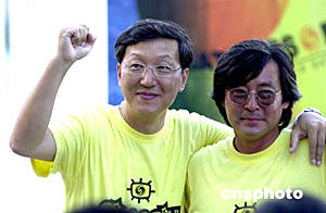 為紀(jì)念鄭和下西洋六百周年,一艘命名為“鳳凰號(hào)”的單桅帆船將由翁以煊、鄭浩駕駛于七月十三日從當(dāng)年鄭和寶船開出的南京出發(fā),展開歷時(shí)八個(gè)月的航海電視行動(dòng)。圖為五月二十七,“鳳凰號(hào)”船員在深圳大鵬灣浪騎游艇俱樂部與媒體記者見面。作者:陳文