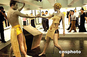 五月二十八日,地處“京西經(jīng)濟(jì)帶”核心地區(qū)的“北京華宇時尚購物中心”開業(yè),兩位藝人現(xiàn)場進(jìn)行人體藝術(shù)表演,為商廈造勢。中新社記者:鄒憲