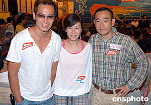 陳豪、陳慧珊、林保怡(左起)5月28日在香港出席無(wú)線電視《雅典奧運(yùn)·上下一心共創(chuàng)新里程》誓師大會(huì)。作者:鄧慶樂(lè)