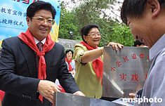二十九日,由中國婦聯(lián)主辦的“為國教子、以德育人”家庭教育實(shí)踐活動(dòng)暨中國小公民道德建設(shè)活動(dòng)實(shí)踐基地授牌儀式在中國兒童中心舉行。圖為中共中央政治局委員王兆國(左)、中國婦聯(lián)主席顧秀蓮為承辦活動(dòng)的基地代表授牌。中新社記者:廖文靜