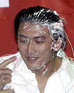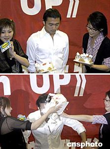 五月二十九日晚,在美卡音像為謝霆鋒新專輯《LISTEN UP》熱賣(mài)舉行的慶功會(huì)上,謝霆鋒毫無(wú)防備被工作人員準(zhǔn)備的雙份蛋糕“擊中”全臉,頓失俊朗形象。中新社記者:高遠(yuǎn)