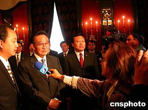 當(dāng)?shù)貢r(shí)間五月三十日,即將結(jié)束對(duì)保加利亞友好訪問(wèn)的中國(guó)全國(guó)人大常委會(huì)委員長(zhǎng)吳邦國(guó)在索非亞接受媒體記者的采訪。中新社記者:戴亞平