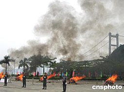 六月三日,廣東有關(guān)部門在虎門現(xiàn)場銷毀了一百六十五公斤毒品,以紀(jì)念民族英雄林則徐虎門硝煙一百六十五周年。廣東虎門現(xiàn)在是全國禁毒教育基地。作者:楊伏山
