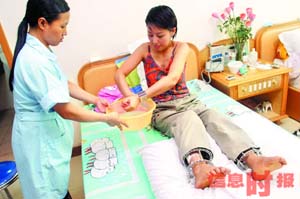 管小姐手拿著一把扳手,一絲不茍地擰著套在腳上的螺絲,極像一個修理機器的工人。擰完螺絲之后,又在醫(yī)生護士的扶助下,握著腳手架在房間里來回移動。據(jù)管小姐介紹,手術(shù)的第二天,她就把身上的鎮(zhèn)痛棒拆除了。但是腳部仍然無法動彈,幾天來一直只能躺在病床上,腳部總感到脹痛,尤其是晚上翻身時,膝部總感到一股鉆心的疼痛,F(xiàn)在每天要打一次消炎針和喝一碗骨頭湯!昂芏嗳硕枷胫浪中g(shù)后想找一個什么樣的男友,而我從來就沒有想過,如果對一個打工仔有感覺,也會嫁給他!惫苄〗闾寡缘。