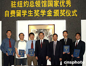“國家優(yōu)秀自費(fèi)留學(xué)生獎(jiǎng)學(xué)金”評(píng)選工作去年開始在美國、日本、英國、法國和德國五個(gè)國家試點(diǎn),首屆共有九十五人獲獎(jiǎng),美國三十人,其中紐約總領(lǐng)館領(lǐng)區(qū)的美國東北部十個(gè)州共有六人獲獎(jiǎng),分別是:哈佛大學(xué)政治學(xué)專業(yè)的閻小駿、麻省理工學(xué)院從事媒體實(shí)驗(yàn)室的潘鵬凱、康乃爾大學(xué)電子工程專業(yè)的吳華強(qiáng)、紐約大學(xué)理論化學(xué)專業(yè)的張大為、新澤西理工學(xué)院通信與信號(hào)處理專業(yè)的何磊、俄亥俄州立大學(xué)化學(xué)物理專業(yè)的劉進(jìn)軍。