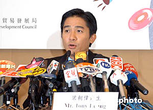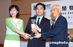 影帝梁朝偉6月8日在香港出席《第八屆香港國(guó)際影視展》新聞發(fā)布會(huì),并獲委任為「2004年度香港影視娛樂(lè)大使」,香港貿(mào)發(fā)局影視娛樂(lè)業(yè)咨詢委員會(huì)主席鄒文懷(右),及貿(mào)發(fā)局服務(wù)業(yè)拓展總監(jiān)陳嘉怡(左)攜手將紀(jì)念品贈(zèng)予梁朝偉。作者:鄧慶樂(lè)