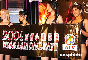 2004亞洲小姐競選發(fā)布會(huì)六月八日在香港舉行,圖為模特在發(fā)布會(huì)上展示標(biāo)語。
