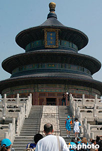 六月九日上午九時(shí),二○○四年雅典奧運(yùn)會火炬北京傳遞活動從北京人民大會堂東門外廣場開始,經(jīng)過一百四十八名火炬手傳遞,最后到達(dá)頤和園。圖為游泳名將羅雪娟手持奧運(yùn)火炬抵達(dá)天壇祈年殿。中新社記者:張宇
