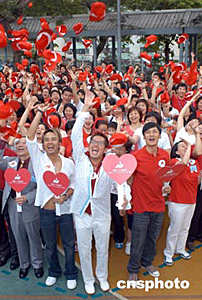 歌星譚詠麟、李克勤、余文樂6月9日在香港出席義務(wù)工作發(fā)展局舉行《全民義工參與賣旗日‧榮譽義工大使委任儀式》,三位榮譽義工大使聯(lián)同上百義工齊聲高呼「凝聚義工力量,發(fā)放愛心光芒」口號。